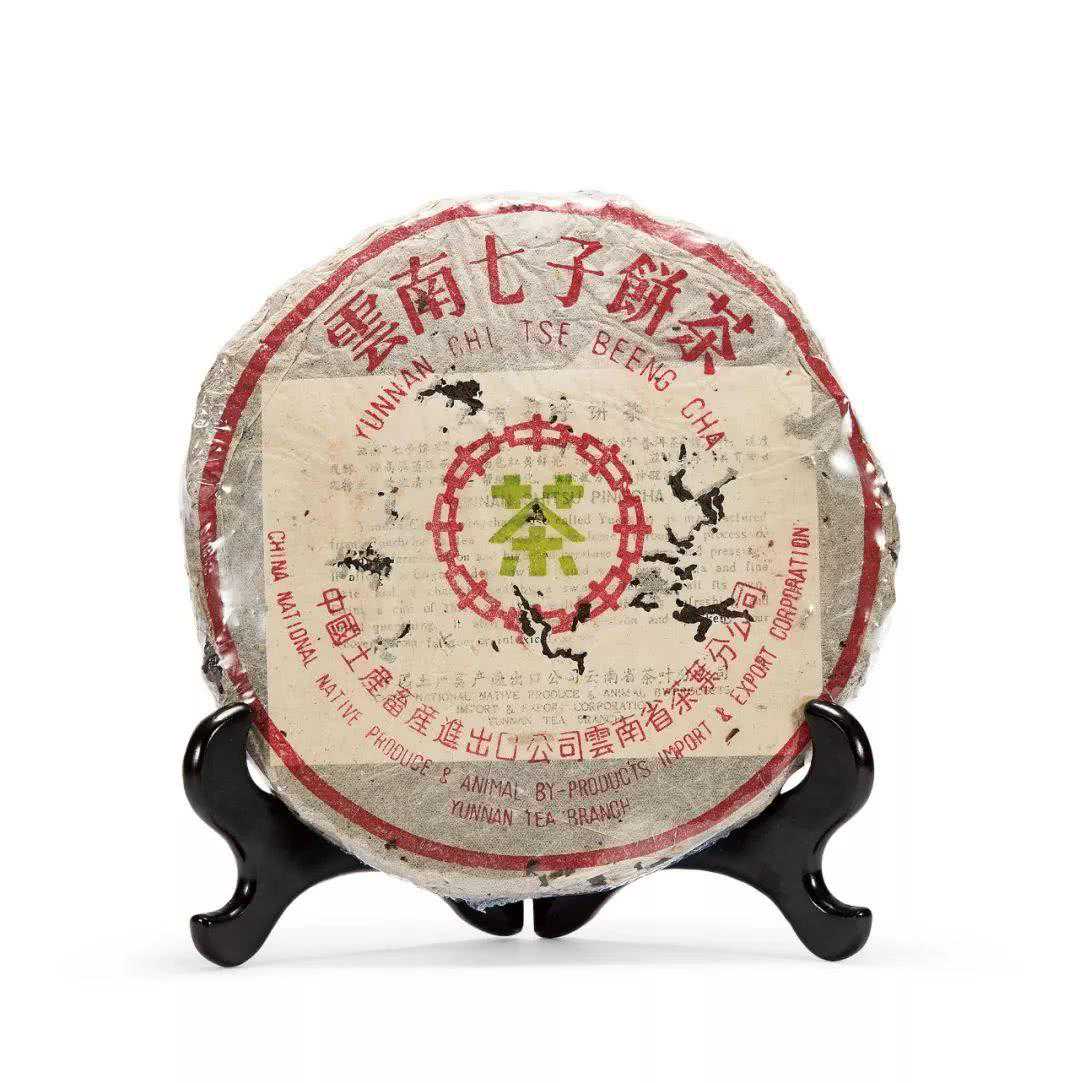 所谓七子饼茶,也是国营茶厂生产的普洱茶,外包纸印有“云南七子饼茶”,中间“茶”字以绿色为主,个别印红、黄色。主要茶品有黄印七子饼、大蓝印七子饼、水蓝印七子饼,还有勐海茶厂出品的7542、7572、8582、7592,及下关茶厂出品的8653、8633等等。其中7542是勐海茶厂在1975年研制出的配方的代号,以4级茶青为主要原料,由于出品年代在1988年,又称“88青饼”。包装纸为手工棉纸,手工盖印。