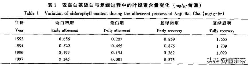 与叶绿素含量变化相反,叶片越白,游离氨基酸的含量越高,最白的时候,安吉白茶的氨基酸含量要比一般茶树品种高2~3倍。