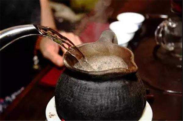 等待砂罐煨热后,放入茶叶,迅速抖动簸荡偎烤。待茶叶烤至微黄色,飘逸出清幽的茶香时,便冲入一勺开水。