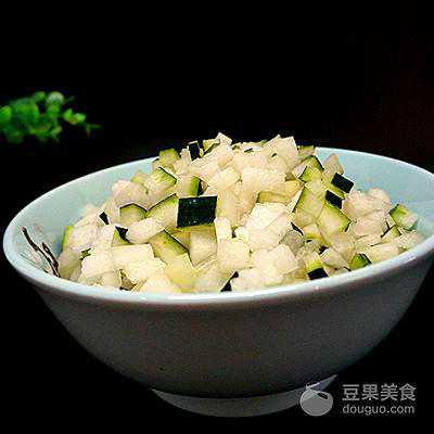 2、连籽带皮切成小丁儿备用,稍微要切的小一点再放进一个大的容器里