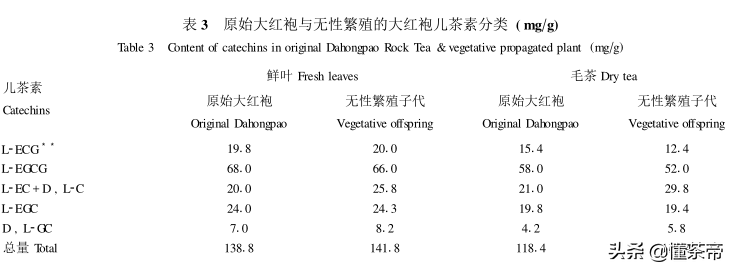 在儿茶素方面,二者总量比较接近。不过,原始大红袍的酯型儿茶素含量更高,非酯型的儿茶素含量却不如无性繁殖的子代。