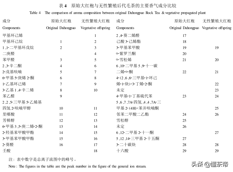 因此,不管是从内含物质上,还是香气成分上,扦插繁殖的子代大红袍在品质上与母本基本是一致的,甚至表现更好。