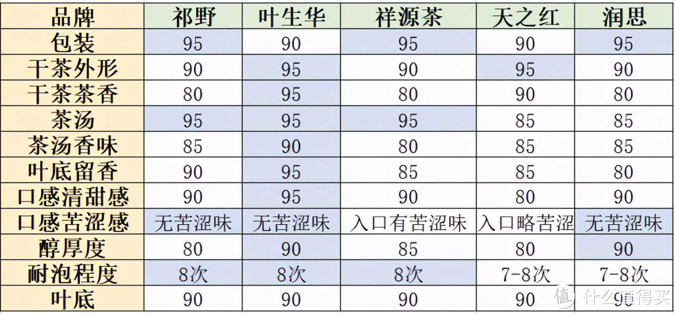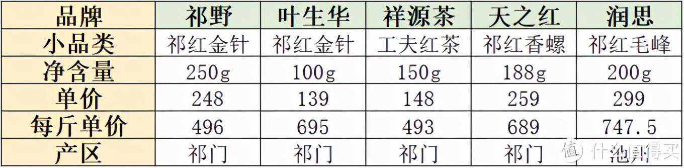 八、总结以下对这次双十一买的5款祁红的优缺点做了个表格统计。其实每款茶都有自己的特点,各有千秋,而且每个人的喜好可能也有明显的差异。祁野和润思的茶,包装比较好看,送人的话其实是很有面子的,不过茶香上的表现都比较差强人意,口感也一般般。叶生华综合起来看我个人是最满意的一款,茶香、口感我个人都觉得没得挑,包装略简单一些,而且这个品牌似乎不是什么大牌,送人可能有点欠妥?不过这个也要看送什么样的人了。祥源茶和天之红都算大牌,送人挺好,自己喝的话,性价比也还不错,茶香和口感上欠了点儿意思,两者相比,祥源茶要优于天之红吧。