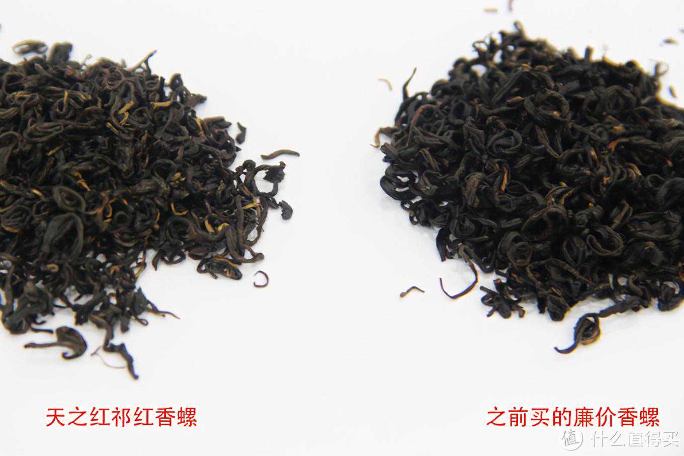 六、天之红祁红香螺祁红香螺在这些年,一直是比较火的一个小分支,我记得前几年购买的时候还算是比较高端的品类。今年再选购祁红香螺的时候却发现大量非常廉价的香螺都出现了,网上甚至有不到100元一斤的香螺。没有那个好汉可以不被低价所诱惑,今年我就买过一次不到200元一斤的祁红香螺,结果肯定是翻车了,所以这次再购买我还是老老实实选择价格比较正常一点的香螺。以下图片是这款天之红香螺和之前购买的那款廉价香螺的干茶对比图,相信大家都可以一眼看出其中差异。