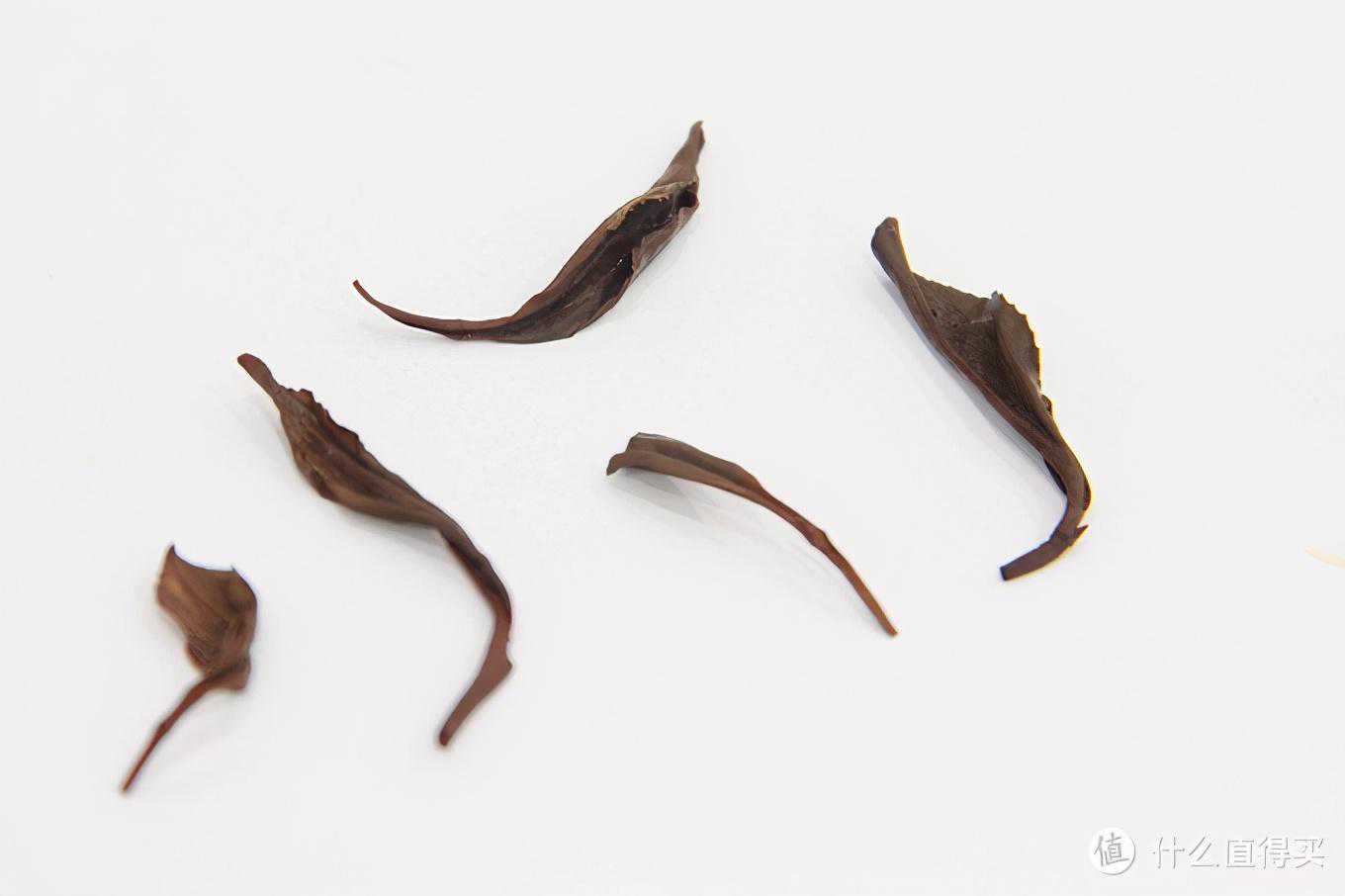 5、叶底如图,颜色上红润,深红色。基本上都是很嫩的芽叶,叶片也都比较小,叶底也比较完整,基本上没有破碎的情况,叶底总体得分大概90分。