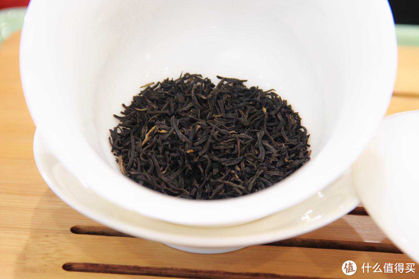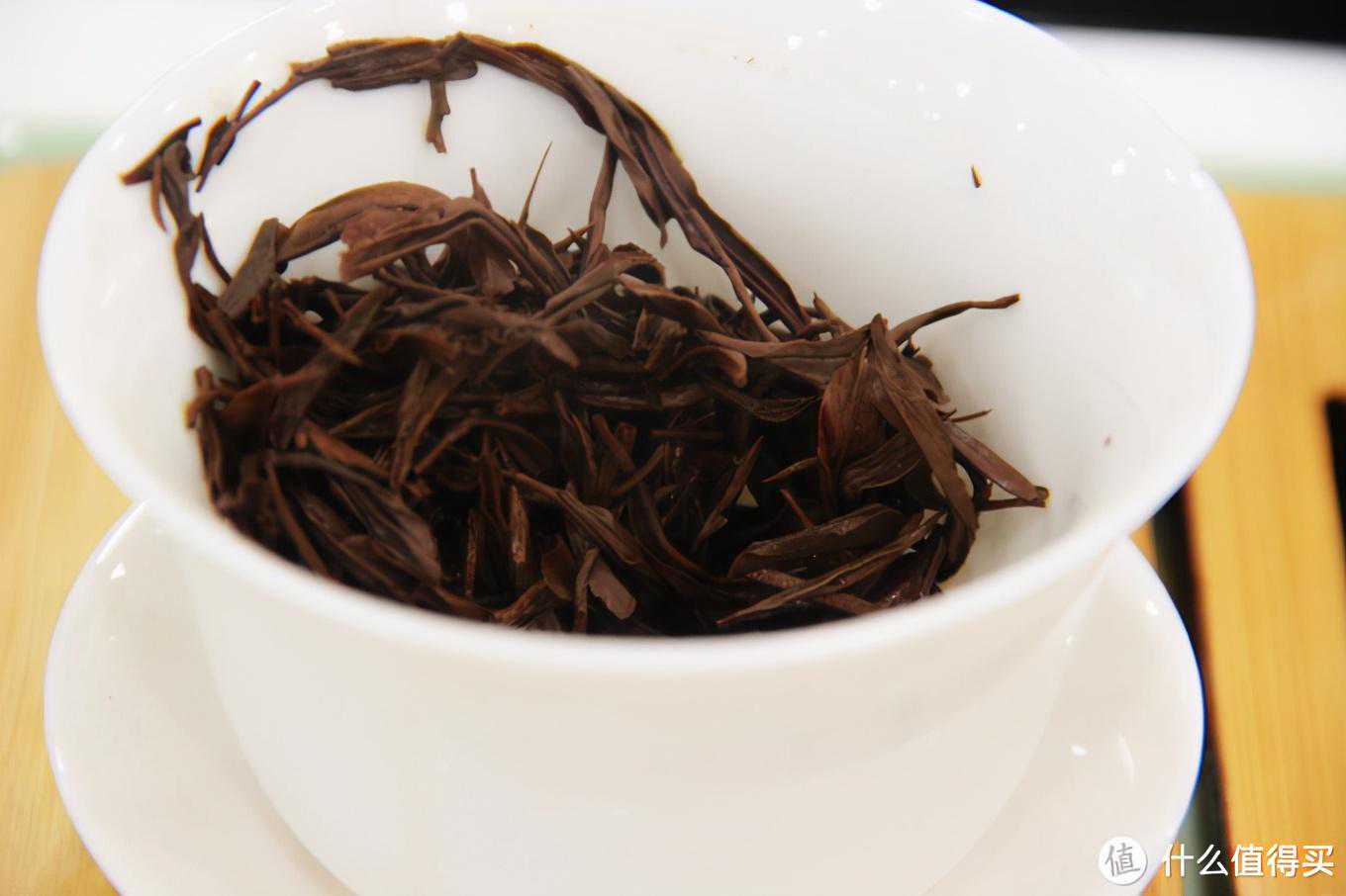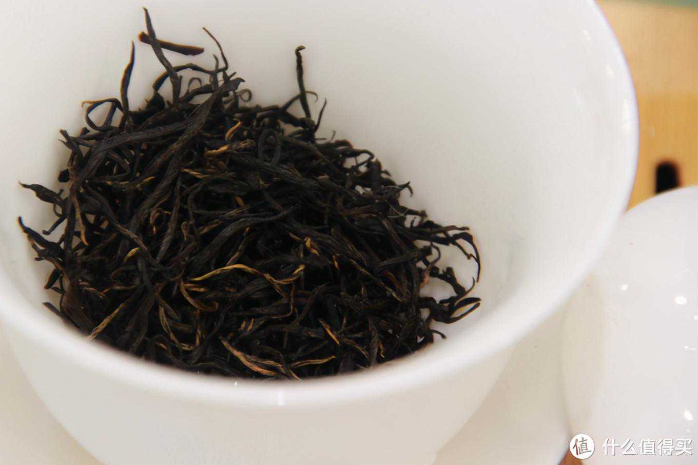 2、干茶与干茶的茶香祁野这款属于祁红金针,最高端的品类。这款茶的干茶如正常祁红金针一样,黑中带金黄色的茶毫,金黄色不是很多,但也非常明显。黑色部分的乌润度一般般,外观上比想象中祁红金针的样子还是有一定差异的。