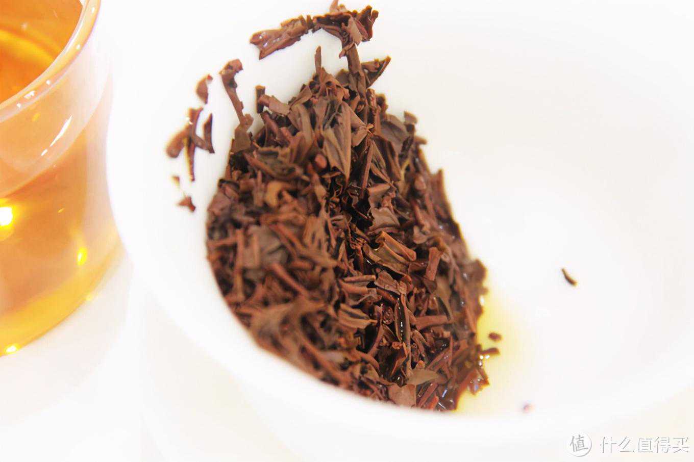 3.汤色和茶香可能是因为工夫红茶是比较碎的,茶汤更容易浸出的缘故,这款茶的汤色颜色很深、呈现深深的琥珀色,非常红润,观感很不错,倒在杯子里也有明显的金圈,茶汤评分可以给95分。茶香方面的表现就不如汤色了,表现比较平淡,跟刚才的干茶茶香表现一致,几乎闻不出很明显的茶香,或者说茶香真的是很平淡的,同时略带一点儿茶腥味。茶香得分80分。沥出茶水之后闻叶底留香,依然是很平淡的,没有那么浓郁。