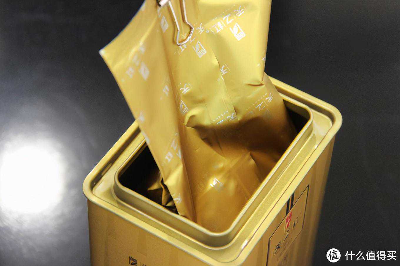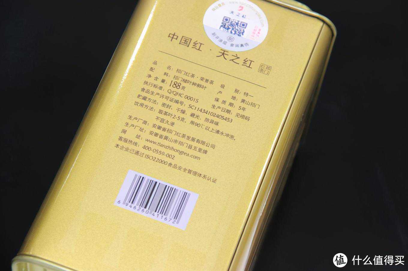 这款天之红的包装采用的是金黄色的大铁罐,铁罐造型跟上面的祁野牌非常类似,但是要更大一些,美观程度上个人感觉不如祁野。铁罐子内部也是一个大的铝箔袋包装,整体包装得分90分吧。