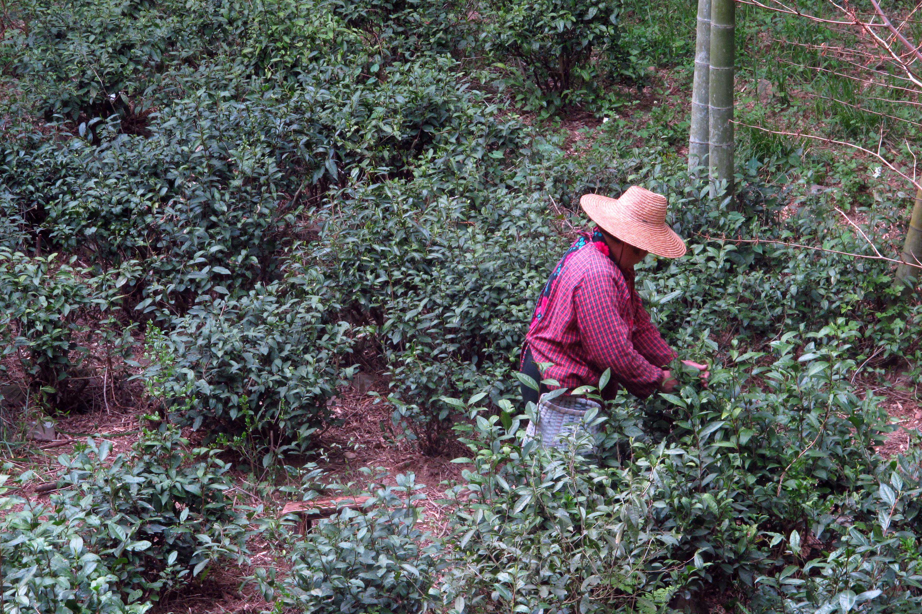 古茶园一直延续到山顶。谷雨将至,此时正是一年中最忙碌的采茶时节,山顶的茶园里,十几个本地农妇,腰间挂着小竹篮,分散在茶园各处,正忙着采撷春茶。