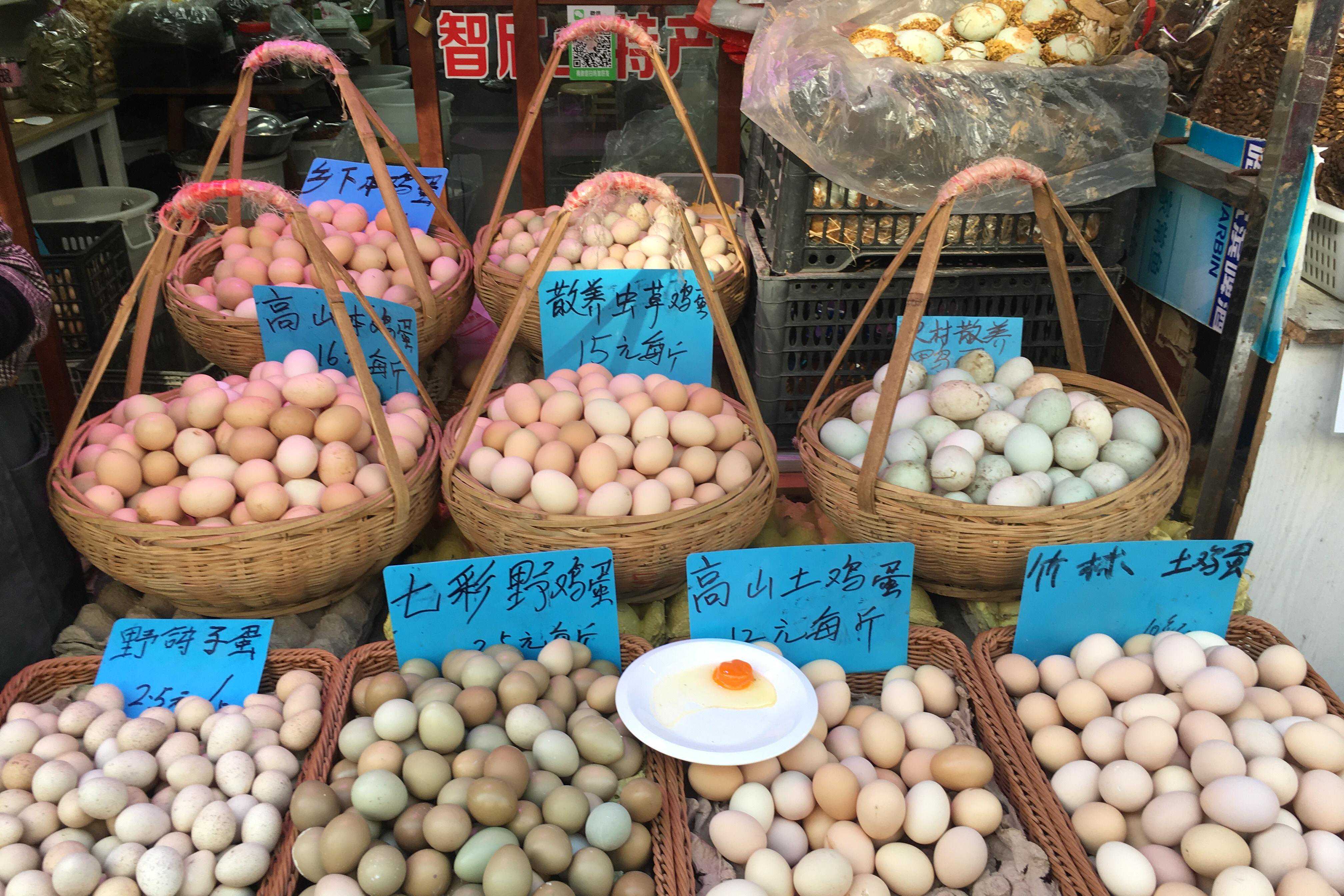 顾渚农贸市场的当地农产品,各种“土鸡蛋”、“野鸡蛋”堆在竹篮子里卖。
