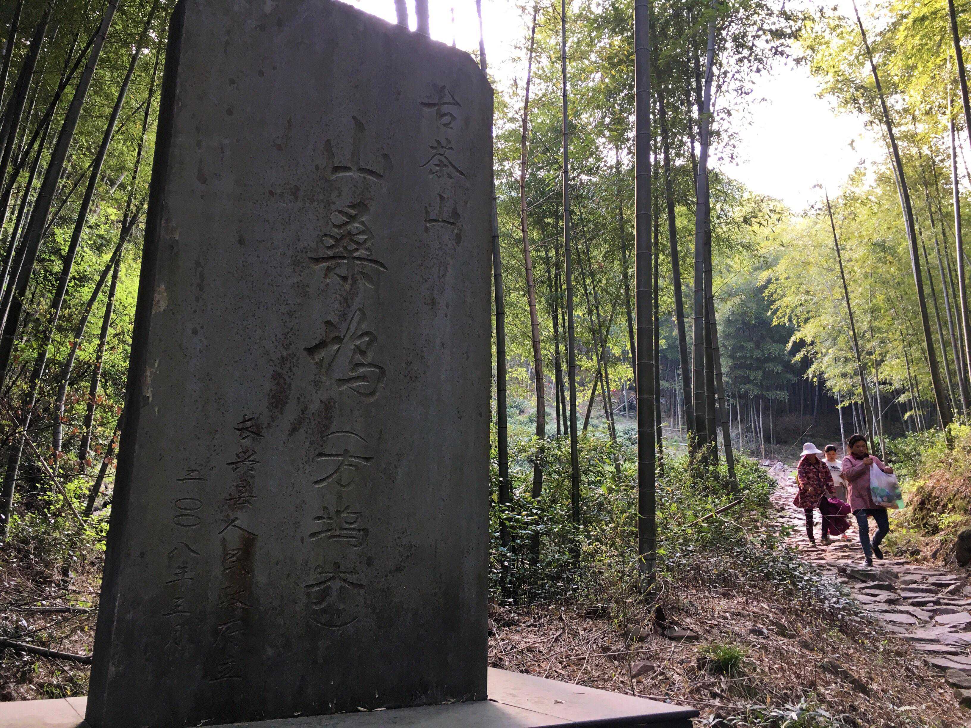 从叙坞岕往西走上半小时,来到方坞岕,有小路通往山里。前行不远,出现一条石阶铺就的上山路,一块“山桑坞”的石碑矗立于山道边,石碑背面介绍此处是陆羽《茶经》中所提及的唐代古茶山。