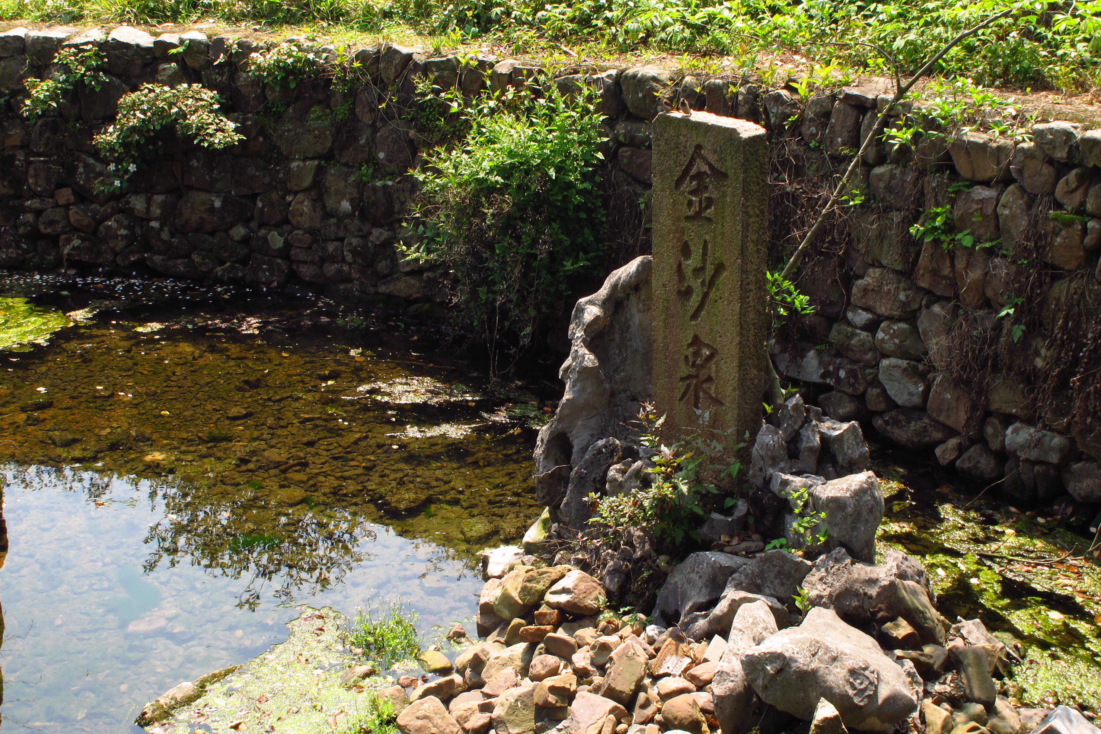 金沙泉就如其名,因水底沙石呈金黄色,所以池水也泛着金属般的光泽。表面看不出泉涌,细看水下石缝,有涓涓泉水从泉眼涌流。旁边砌了两个蓄水池,可以供人取用。我用瓶子装了些水,打算回去用来泡茶。