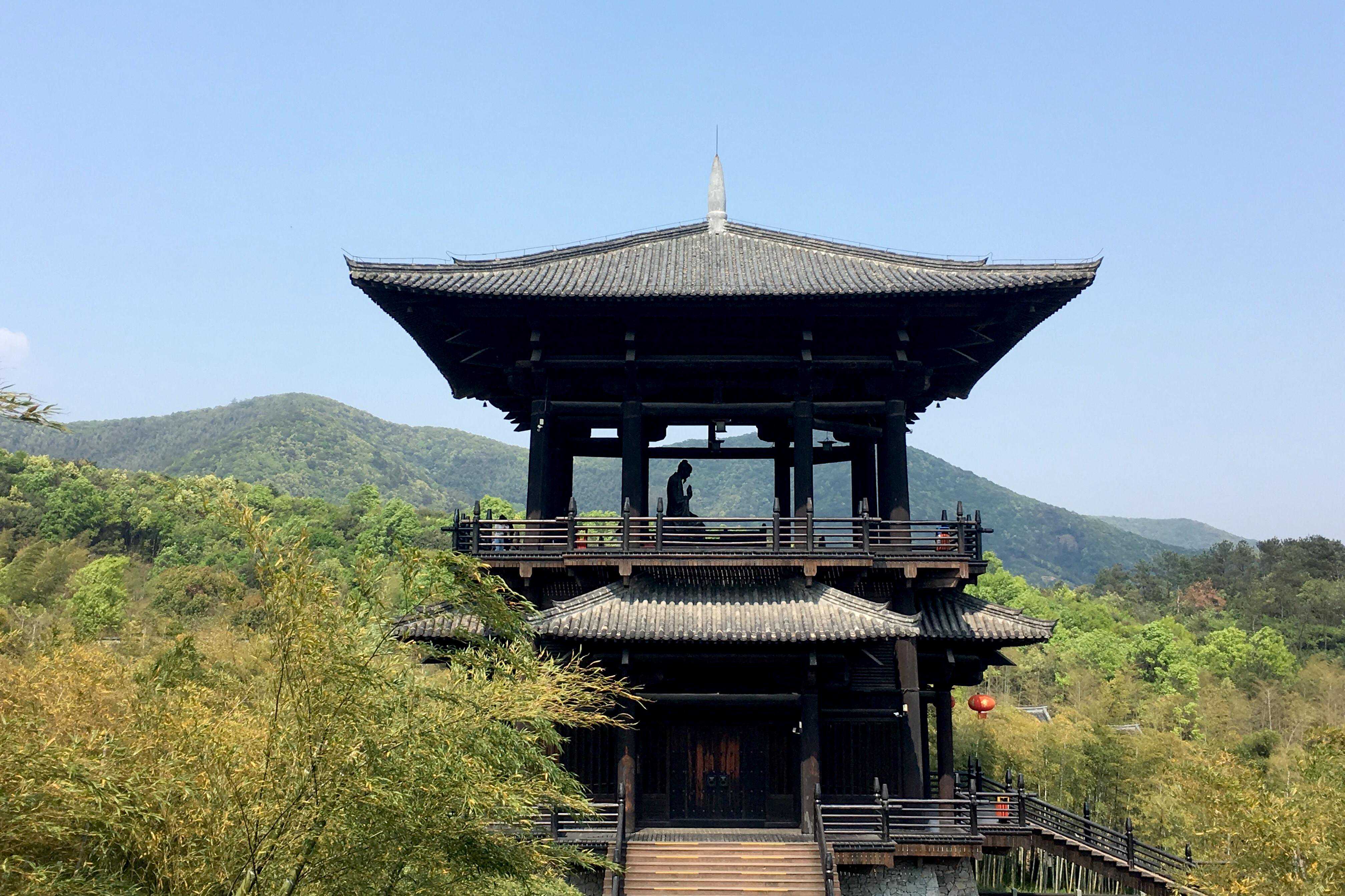 重建的大唐贡茶院,现在已经没有制茶的功能,主要是一处可以观光与喝茶的景点(门票包含茶券)。周围群山错落,翠竹层叠,登上纪念茶圣的陆羽阁,可以俯瞰整个顾渚村。