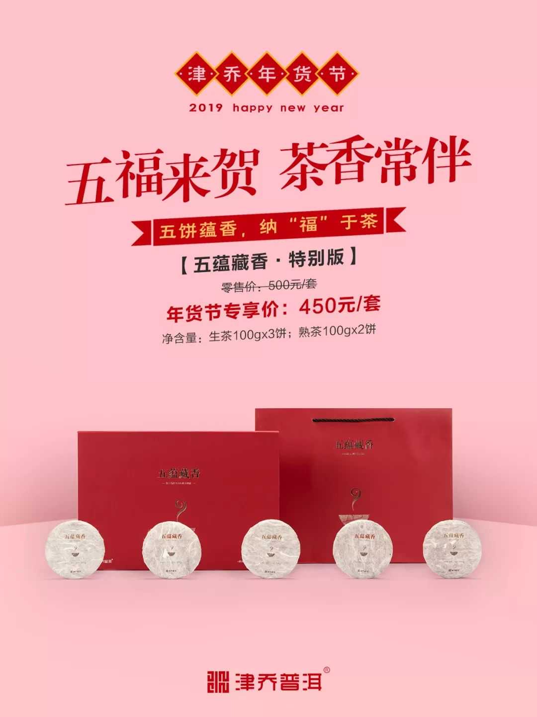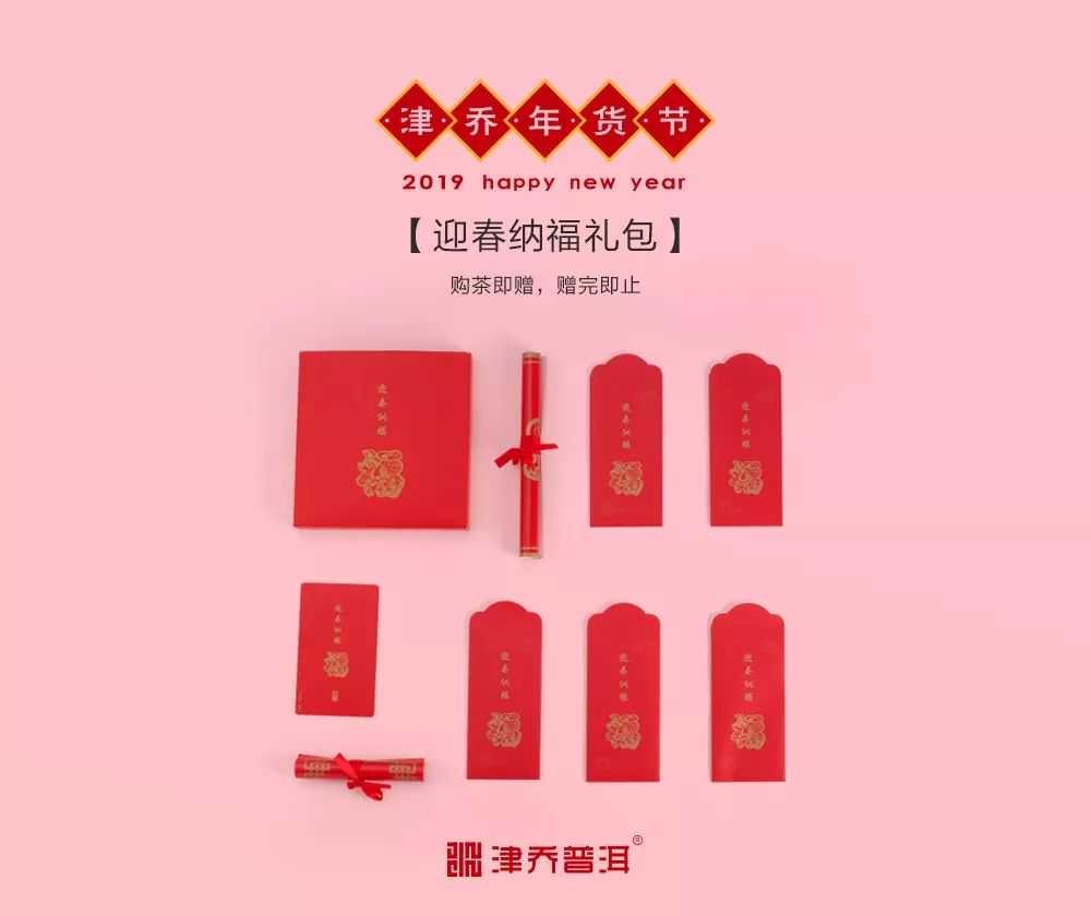 “迎春纳福”年味礼包,含春联1幅、红包5个、贺卡1张,津乔年货节期间购茶即送,先购先得。