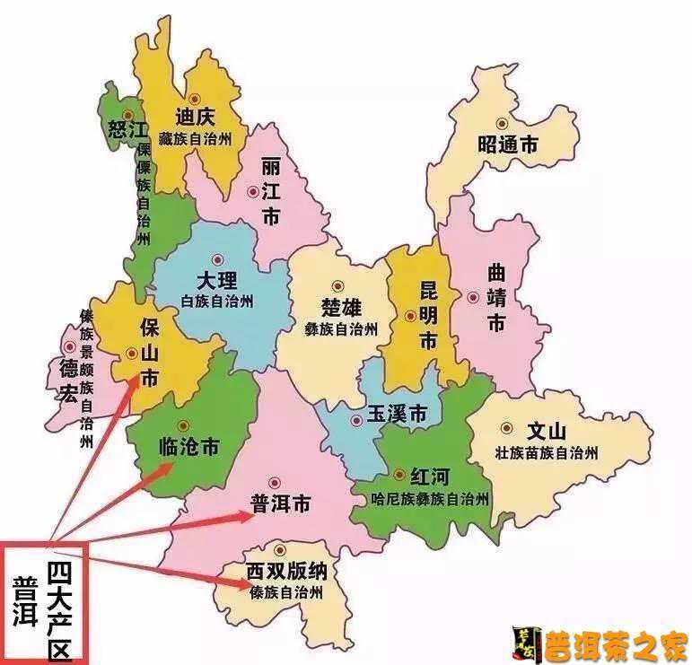 普洱茶的主要产区分布在云南西南部的澜沧江中下游流域。按口味主体特点分类,可划分成四大板块: