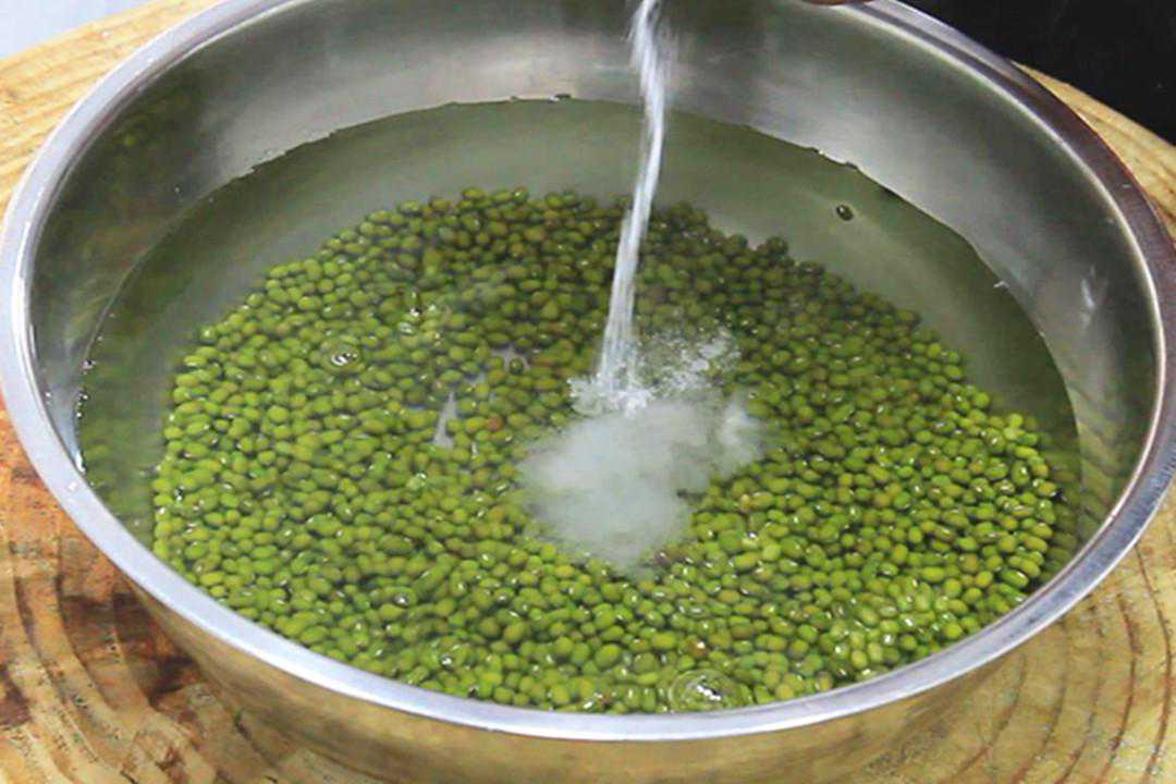 1.首先,把绿豆洗干净放入清水中,加入少许碱面浸泡几个小时,加入碱面绿豆更容易泡开,一般都是前一天泡上,不耽误第二天煮。