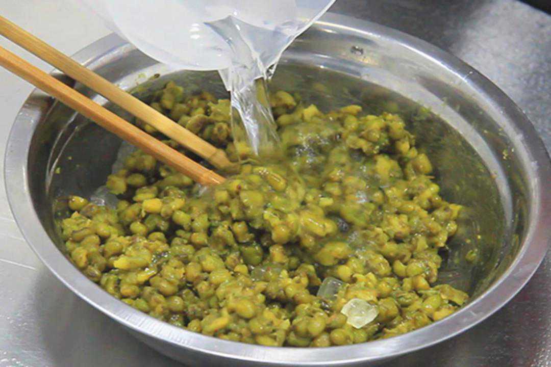 3.十五分钟以后,把煮好的绿豆取出来,趁热放入适量的冰糖增加甜度,搅拌化开冰糖,再添加适量的纯净水,水量以没过绿豆为宜,再次搅拌均匀。