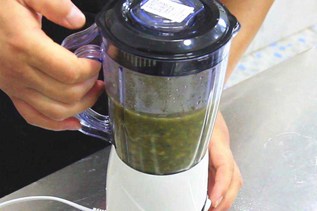 4.然后把绿豆倒入打汁机中,打成绿豆沙,这样喝起来口感更加沙绵。