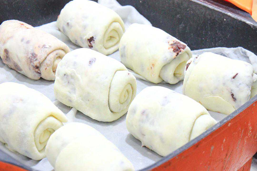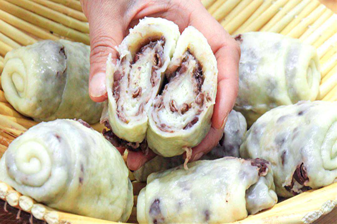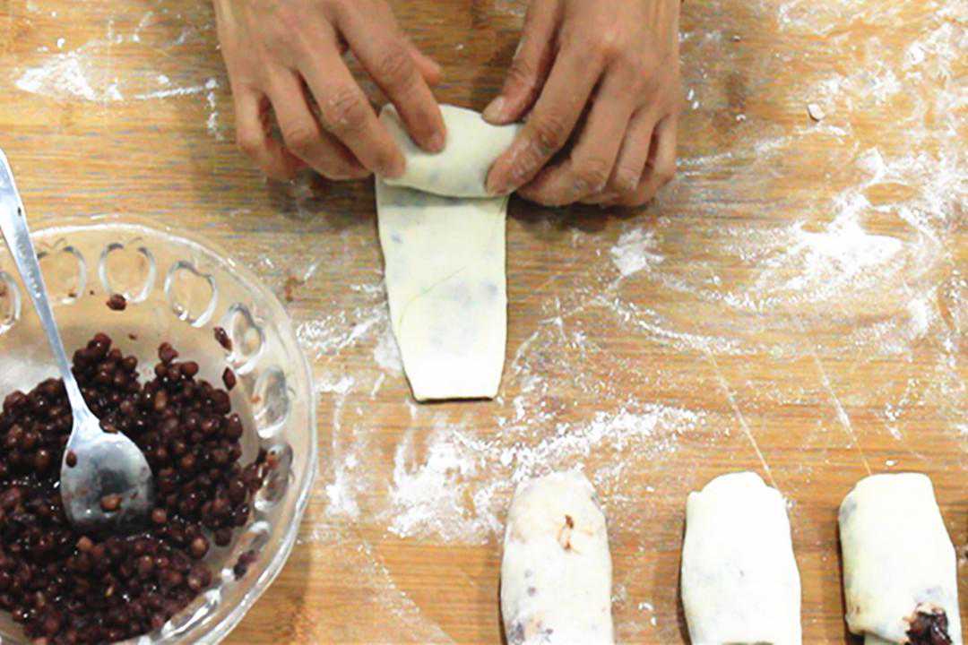 4.发酵好的面团非常蓬松、内部都是蜂窝眼,在案板上撒点干面粉,取出面团揉搓排气以后切成相同大小的面剂子。把面剂子揉圆、擀成小饼,放上适量的红豆泥卷起来,然后压扁、擀成舌状、再卷起来,目的是把红豆压实,这样山药红豆卷的生坯就做好了,用细布盖住,放在一边再发酵10分钟,蒸出来更暄软。