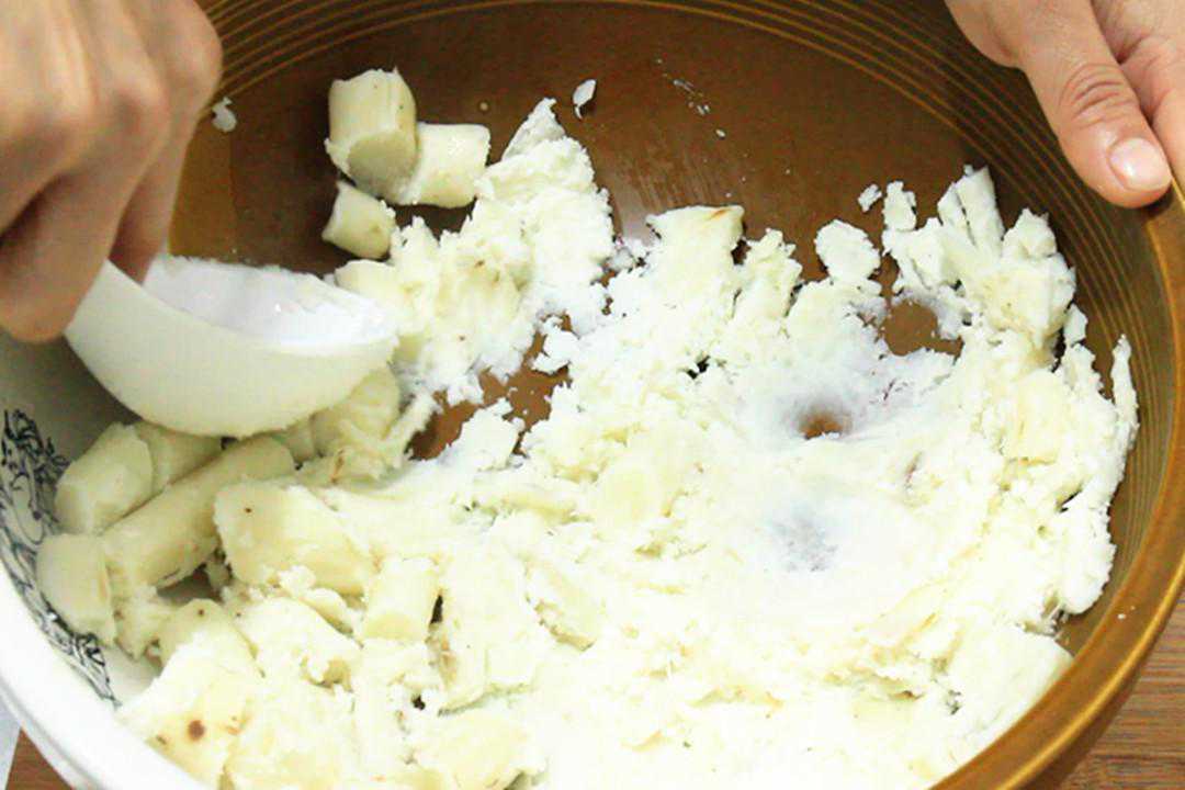 3.山药几根把外皮削干净、切成段,然后放入锅中蒸20分钟,蒸熟以后取出来,压成山药泥。