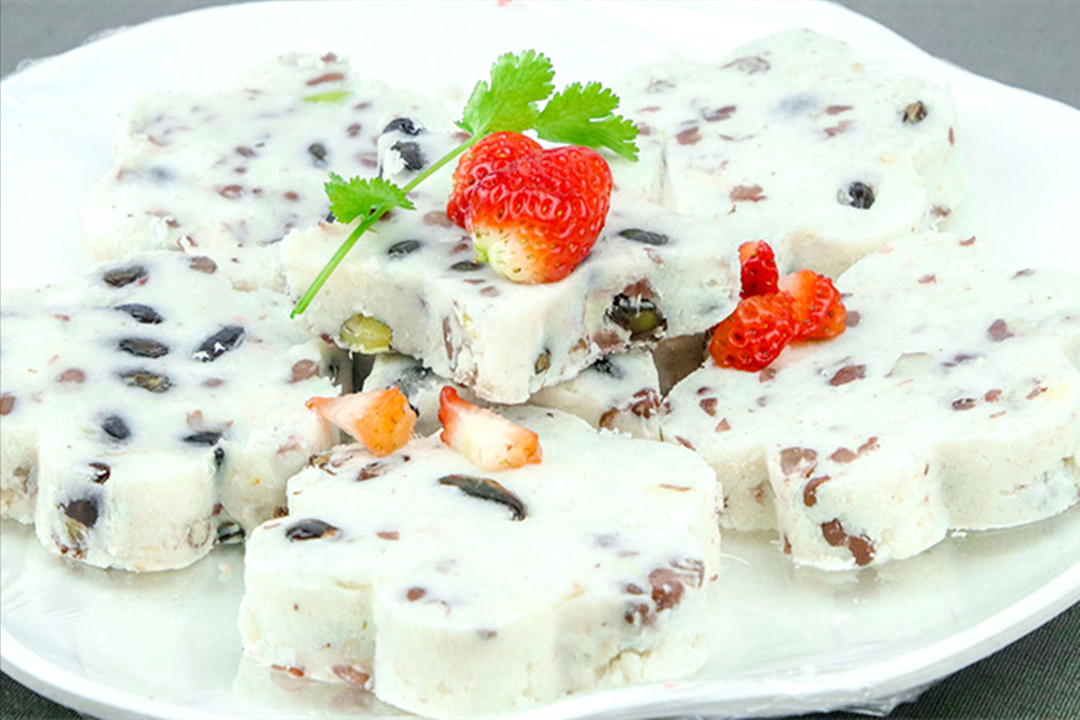 5.然后把黑豆山药泥用模具摁压成不同的形状,小孩和老人直接吃常温的,抵抗力比较好的年轻人也可以放冰箱里冷藏一下,伴着酸奶、水果一起吃,更加的清凉解暑。