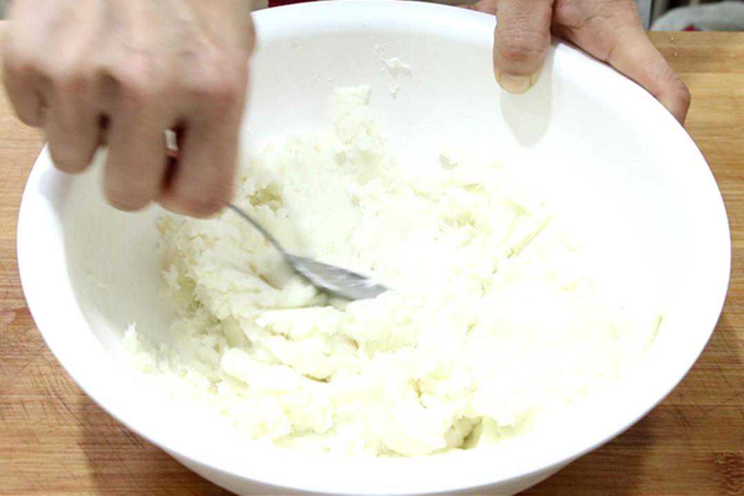 2.山药把外皮削干净、切成段,放入上大气的蒸锅里面,中火蒸15分钟,蒸熟以后取出来压成山药泥,放在一边晾凉。