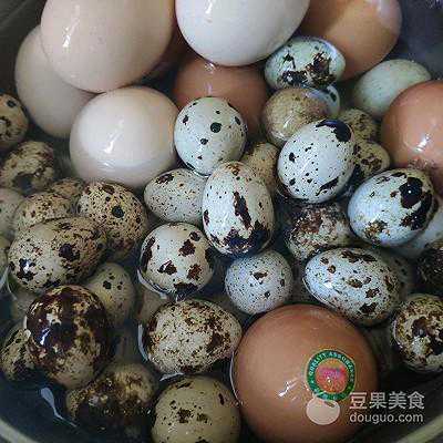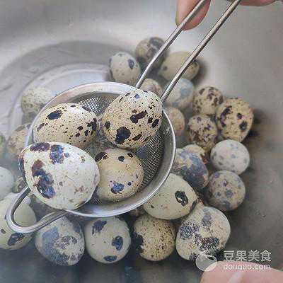 5、煮开,把鹌鹑蛋捞出来。鸡蛋不要捞出来,鸡蛋继续煮一分钟。把鹌鹑蛋表面敲碎。