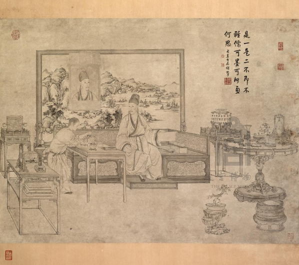 第二单元“茶道尚和”中展出的《乾隆皇帝是一是二图轴》,构图学习宋人画法,乾隆身着汉装,一个唯美的喝茶场景,装茶的壶是明代青花,杯子是玉器(也可能是宋代的定窑系白瓷),周边陈设的器物有新石器时代的玉璧、商代的青铜觚、王莽时的嘉量、受西亚文化影响的青花缠枝莲纹扁壶、与藏传佛教有关的“大德吉祥场”铭盖罐、受西洋家具影响的圆桌,传达了乾隆典守中华传统文化、维护国家统一的意象,是茶文化与中华文明关系的缩影。