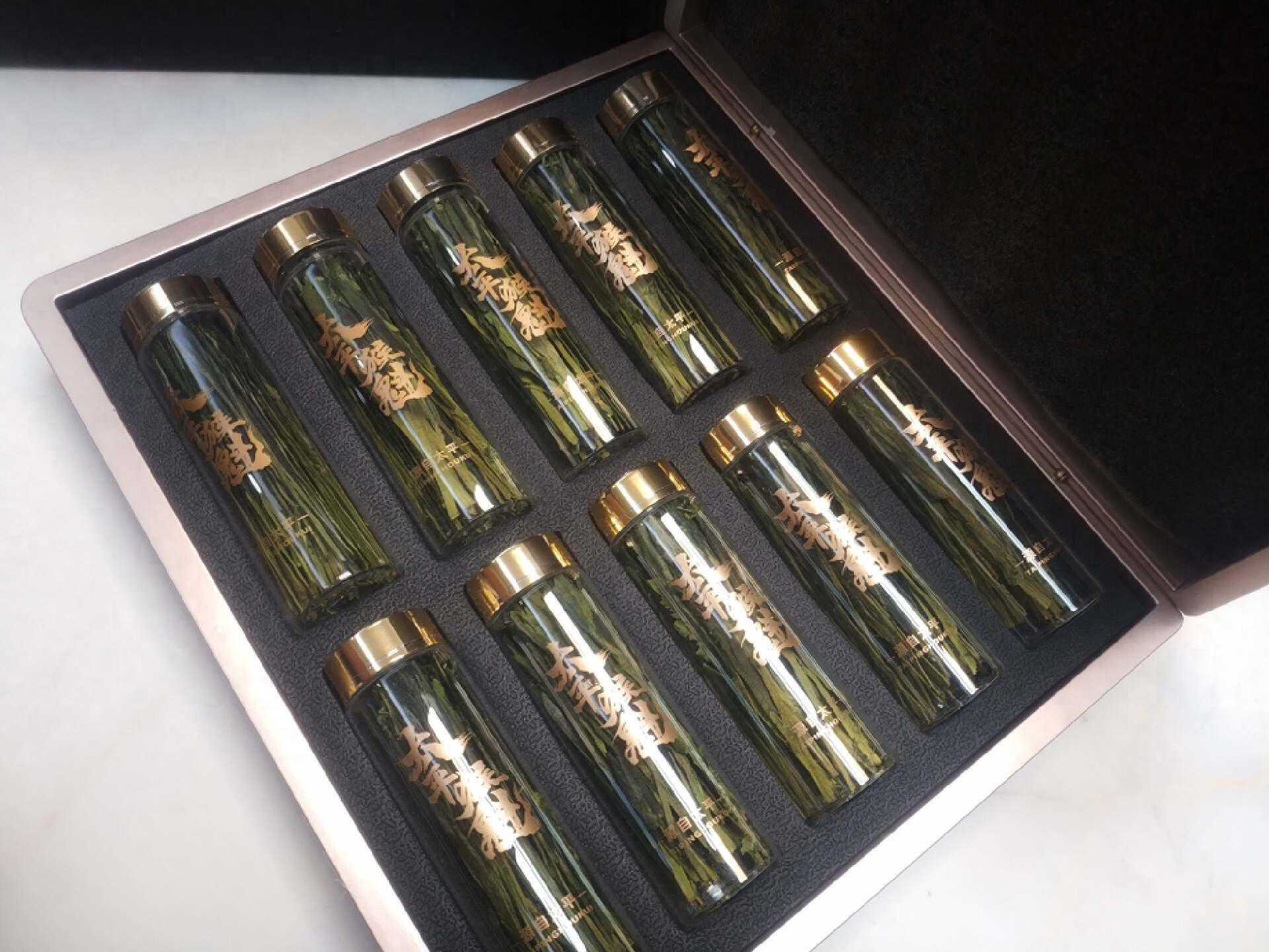 我们先来看看太平猴魁茶的包装。开启包装盒,我们可以看到里面分为十瓶小包装。每一瓶都非常精致,包装上的字纹也透露出深厚的文化底蕴。瓶盖金灿灿的,
