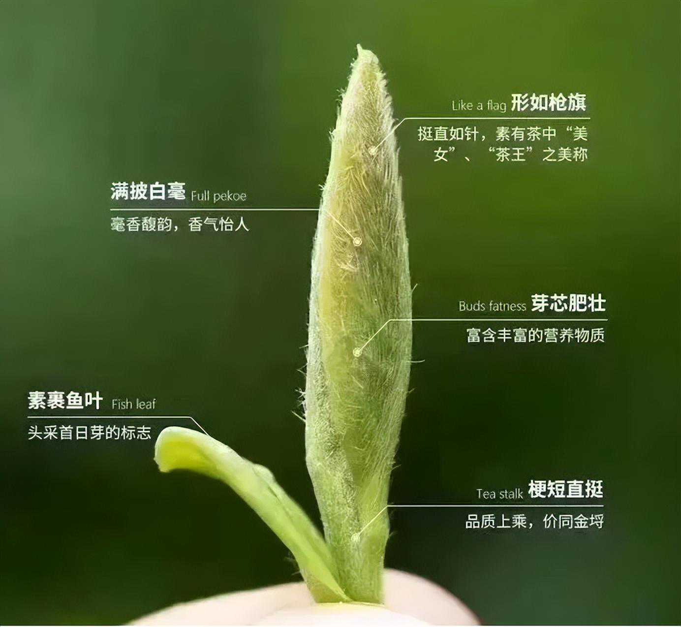头采白毫银针的特点是“一旗一枪”,芽头旁边带有小小的鱼叶,也称作“叶壳”。