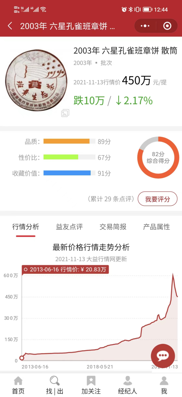 红星资本局注意到,大益有一款2003年批次的“六星孔雀班章饼散筒”2021年11月13日行情价为450万一提,合计90万一斤,价超黄金。但其在2021年3月12日的行情价还在600万元,大半年的时间就跌了150万元。