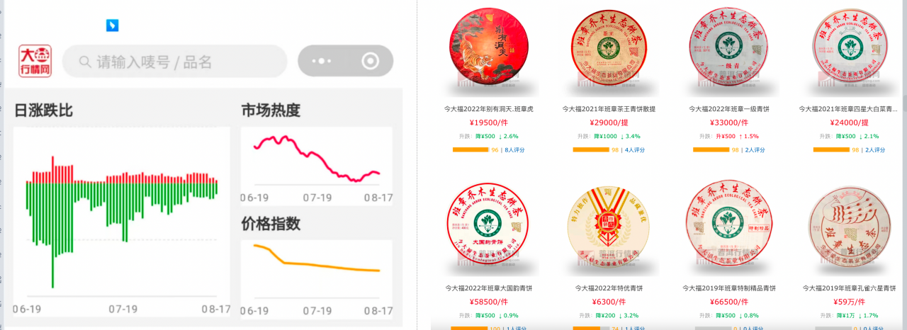 在一家名为“大益行情网”的小程序中,有许多天价普洱茶。上万元一提的茶随处可见,一提上百万的茶在这里也真实存在着。而在这个小程序中,每个茶就像一只股票,拥有自己的代码和K线等元素。