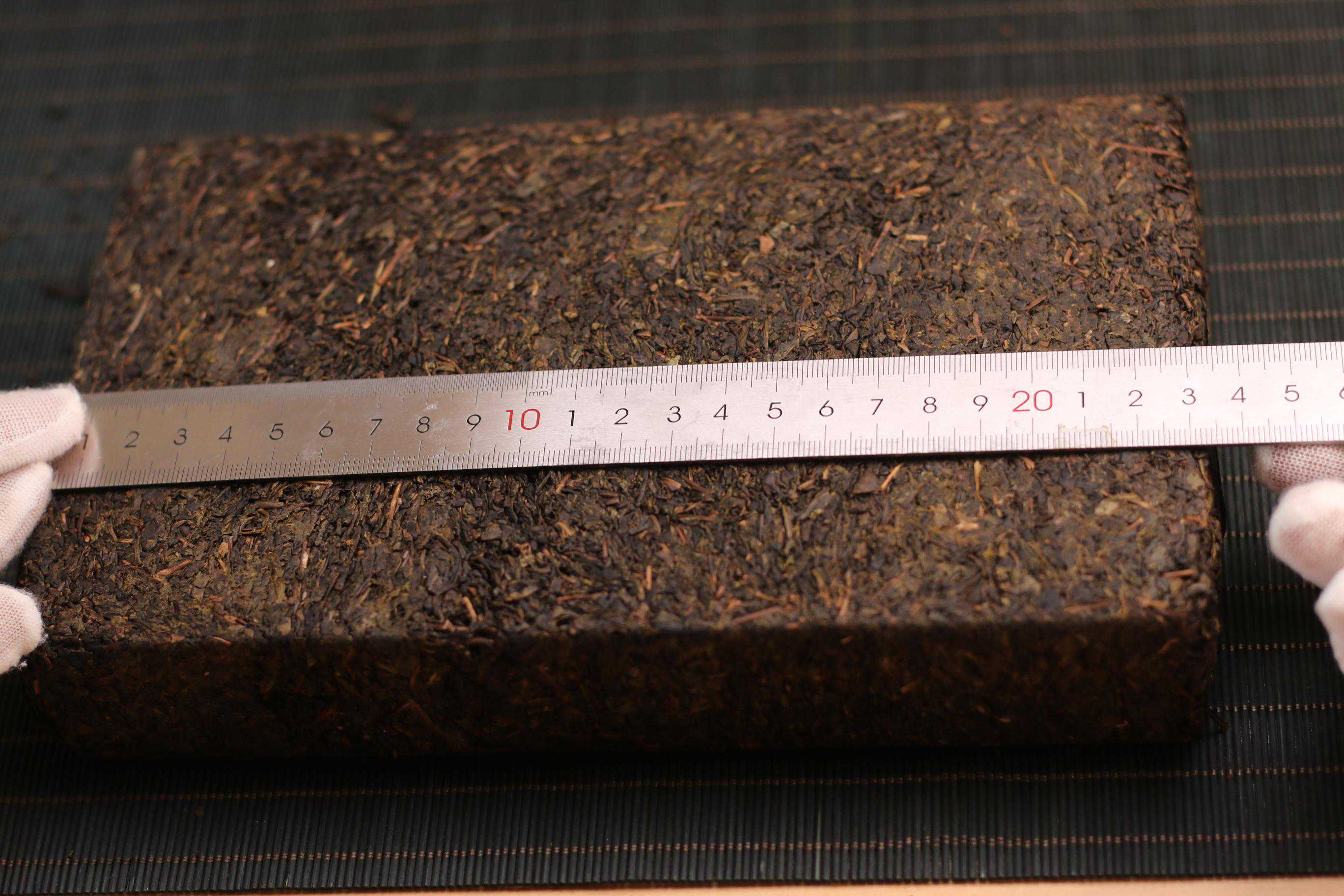 为了更直观的给大家展现手筑和机压茶砖的密度对比,我们再拿白沙溪天茯(3年茶)和白沙溪经典1939黑砖(5年茶)这两款茶来看一下,前者是手筑茶,后者是机压茶。这两款茶的重量都是1000g。经我们实际测算,白沙溪天茯每立方厘米的重量是0.79,白沙溪经典1939黑砖的每立方厘米重量是1.06,相差近百分之三十,确实机压茶更紧。
