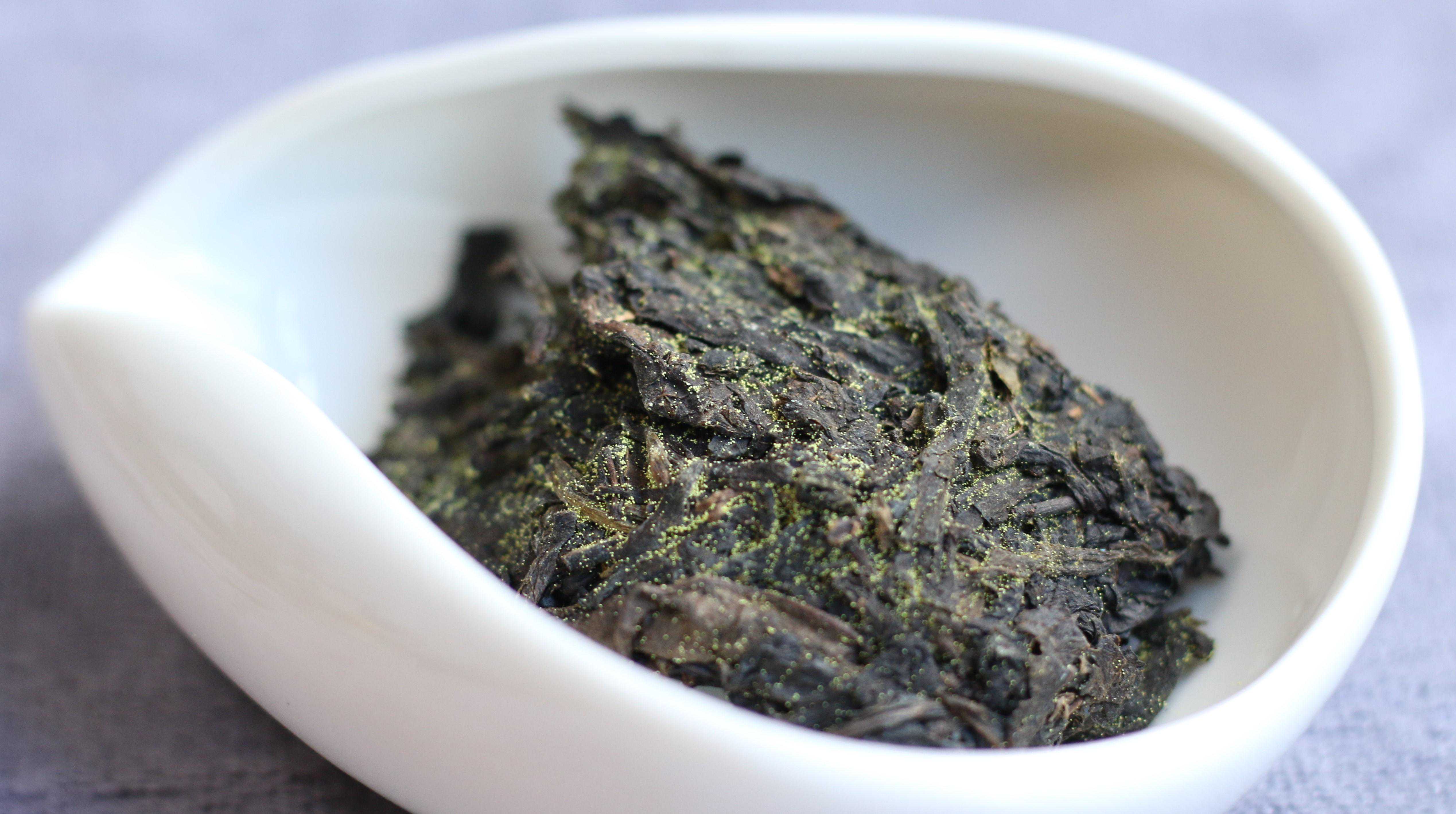 其实要说到金花,它除了与茶叶的加工方式有关外,还与用料及发花工艺有很大关系。原料更加精致,茶叶更加细嫩的黑茶,发花效果也会更好,金花更加丰富。上面这款白沙溪天茯当年茶,之所以能有这么茂盛的金花,也有它用料不错的原因。