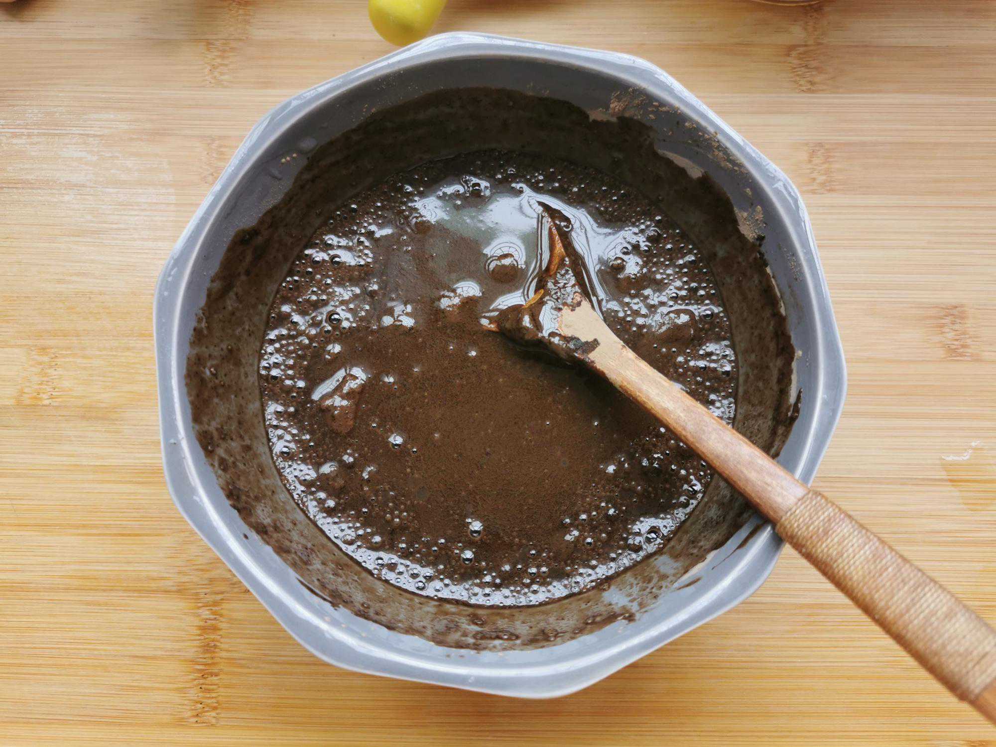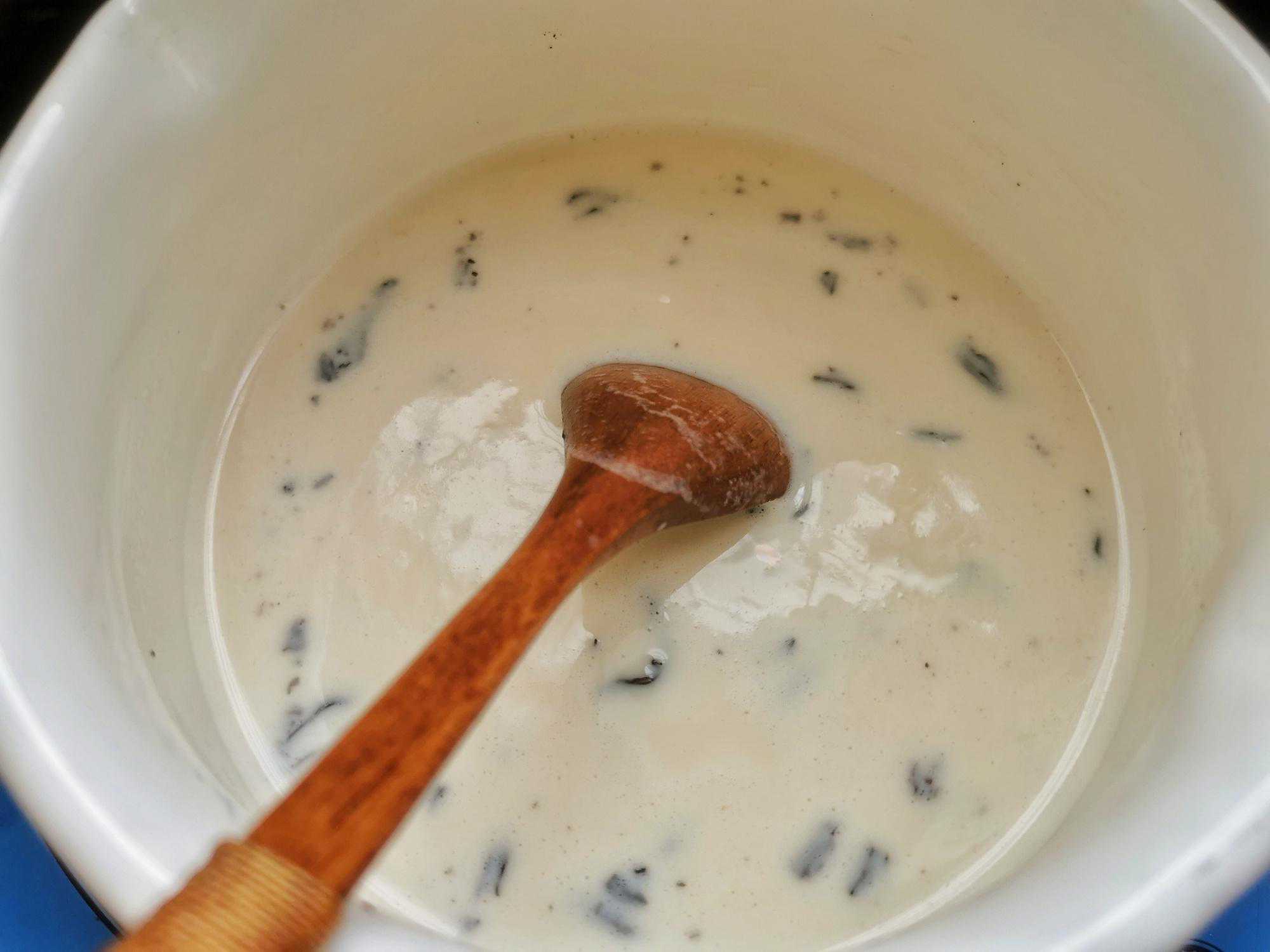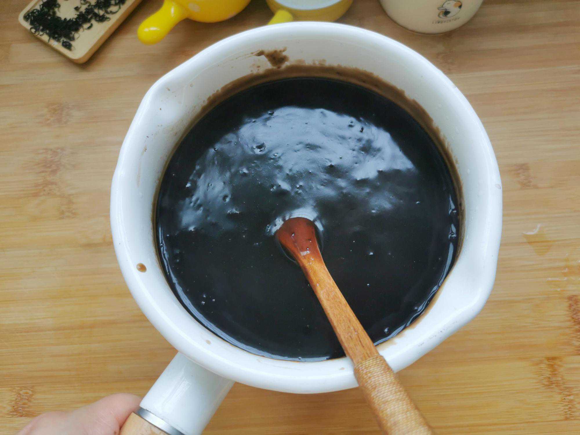 3、500克凉水倒入锅中煮开,倒入刚刚搅拌好的仙草水,边煮边不停地搅拌,煮至稍微粘稠的状态。