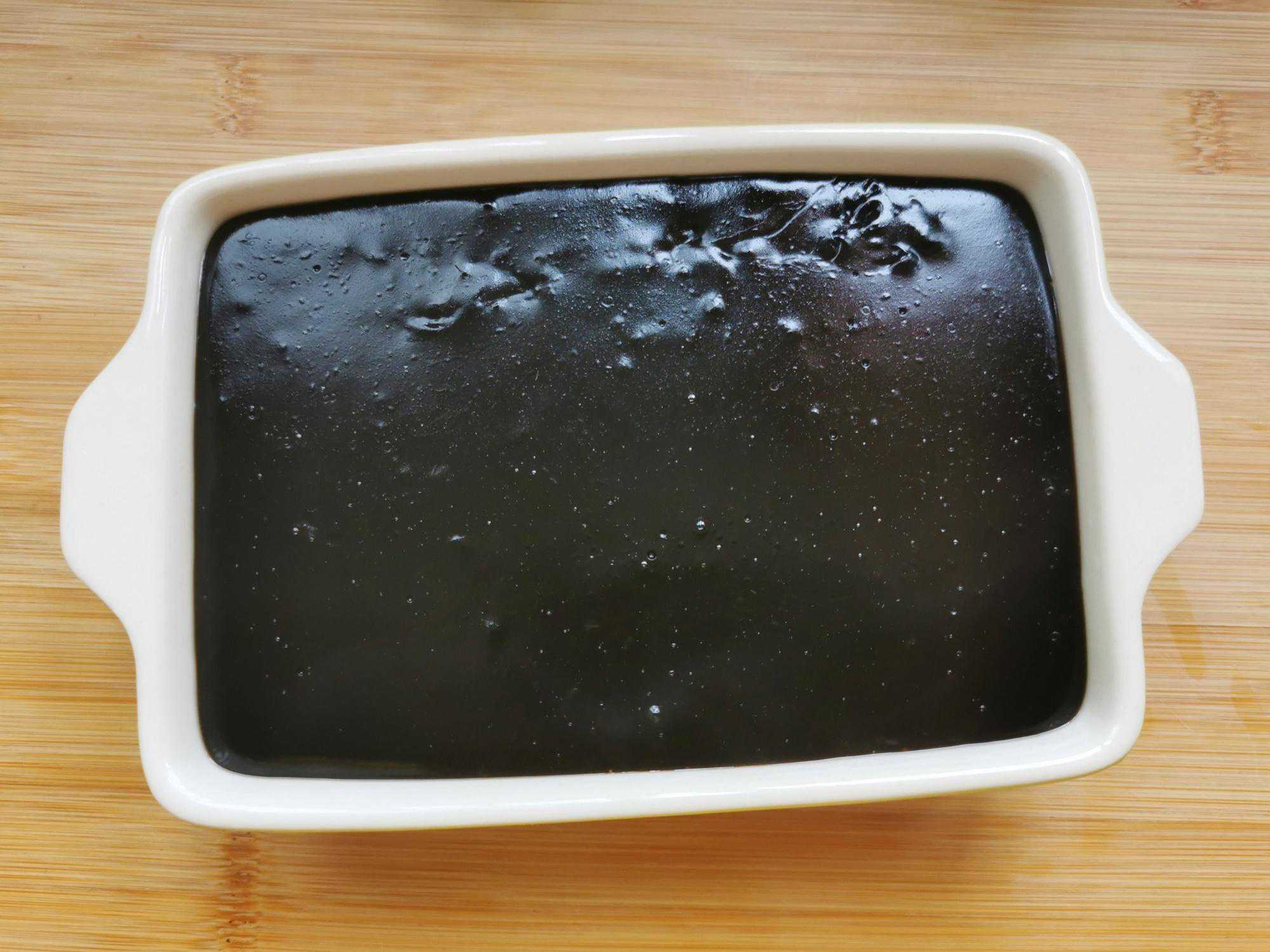 4、将煮好的仙草糊糊倒入碗中,2分钟的时间仙草糊糊就凝固成仙草冻了,50克仙草粉可以煮出两大碗仙草冻。