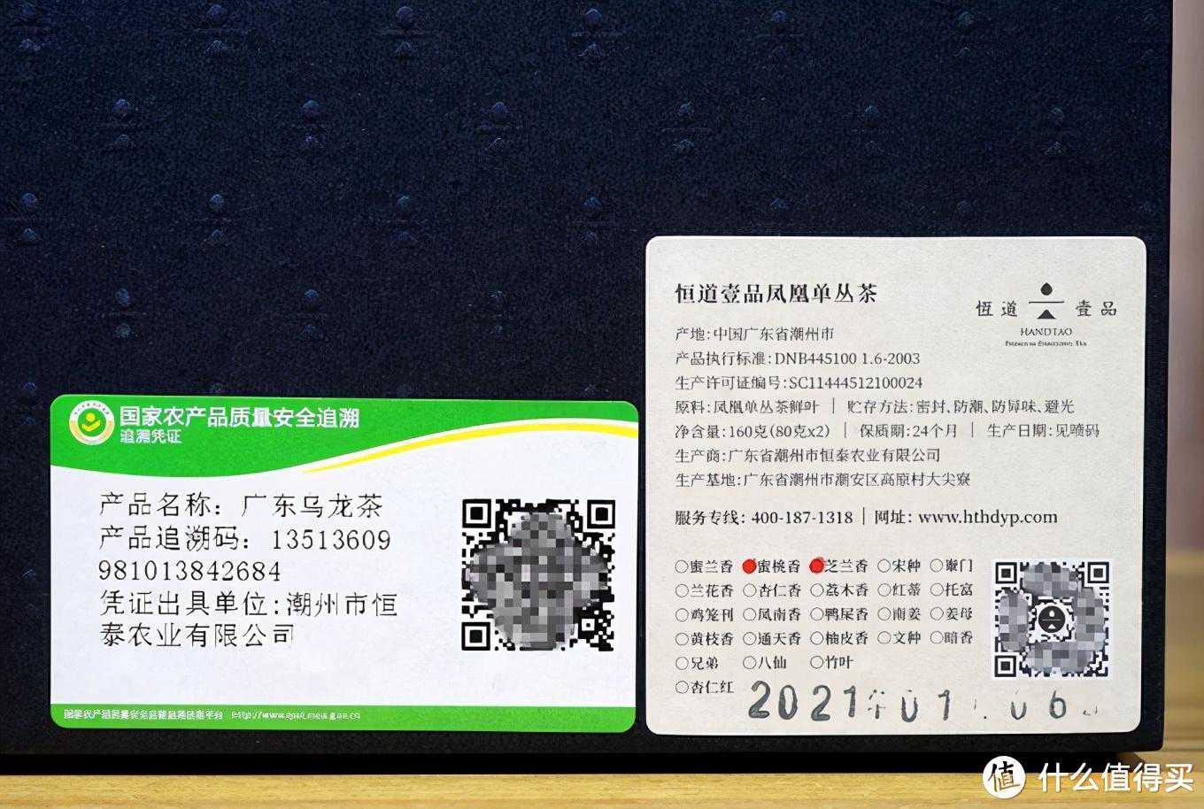 第一款是恒道壹品的蜜桃香和芝兰香组合装。两种茶叶各80g,总的重量160g,京东价格是399元,一斤单价算下来是大约1200元/斤。拆开算的话,单买蜜桃香是1500元/斤,单买芝兰香是920元/斤。在包装上,千元以上的产品果然高档很多。包装盒上贴着有机茶的朔源码,还有产品标签,注明产地、生产标准和具体香型。从贴纸上可以看出恒道壹品的茶共有24个香型。其他香型我准备这段时间慢慢来试。蜜桃香是金色罐,芝兰香是红色罐。包装盒中还附了有机茶检测报告证书和一个玉米纤维泡袋,可以用于装细碎茶叶泡茶。这两种茶叶中,蜜桃香是恒道壹品的明星产品。手工精选版的蜜桃香曾经拿过比赛大奖,一斤可以卖到上万元。而我们在电商买到的算是销售版,品质不如参赛版本,但是也可以从中领略一下蜜桃香的独特之处。