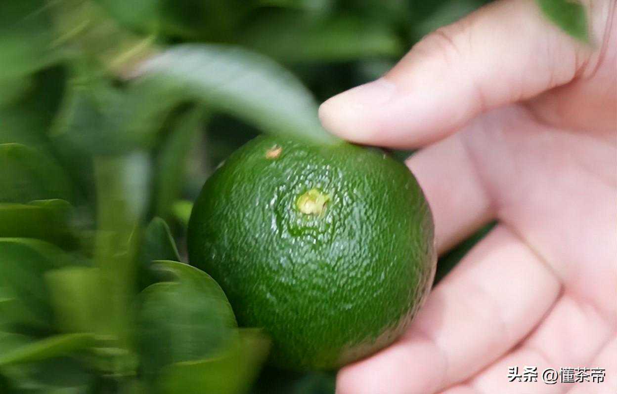 一般采摘7-8月份的新会茶枝柑,这时的柑果皮尚未成熟,外皮还是呈青褐色,油室点微凹且密集,质硬皮薄,味辛气香。