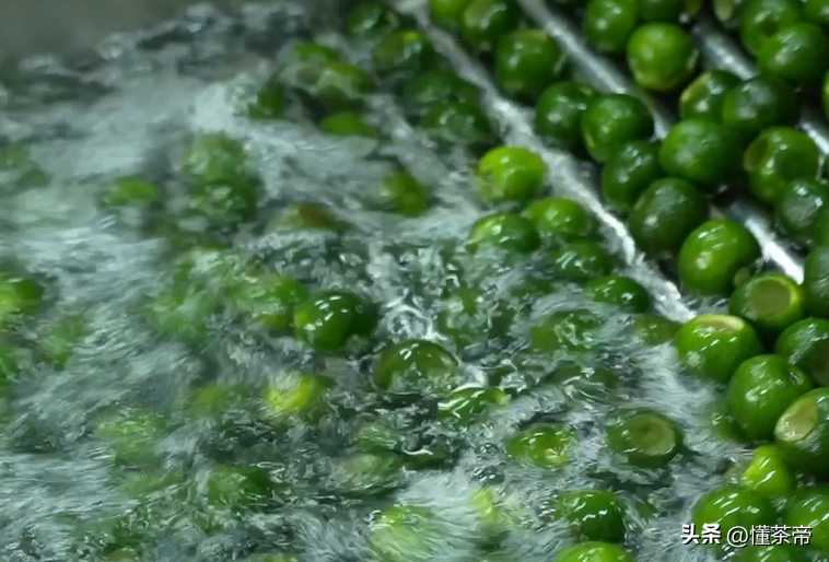 采用机器自动清洗,首先将鲜果倒进含有臭氧的清洗池浸泡2-3分钟,再转至软毛刷区域更深层次的清洁小青柑表面的油室。