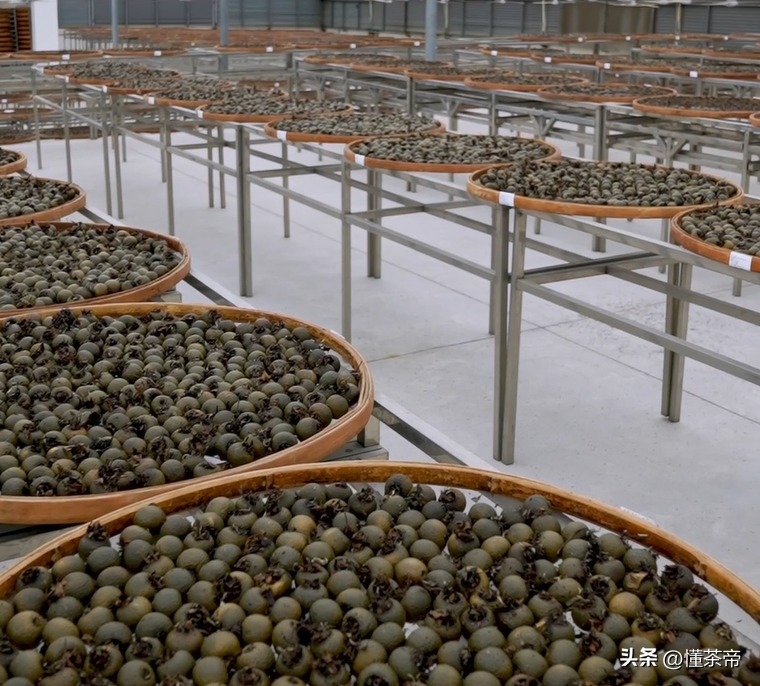 遮光防雨的晒场内,为了快速挥发小青柑中茶叶的水分,避免茶叶在果壳内二次发酵,还配置了电风扇加速空气流动。