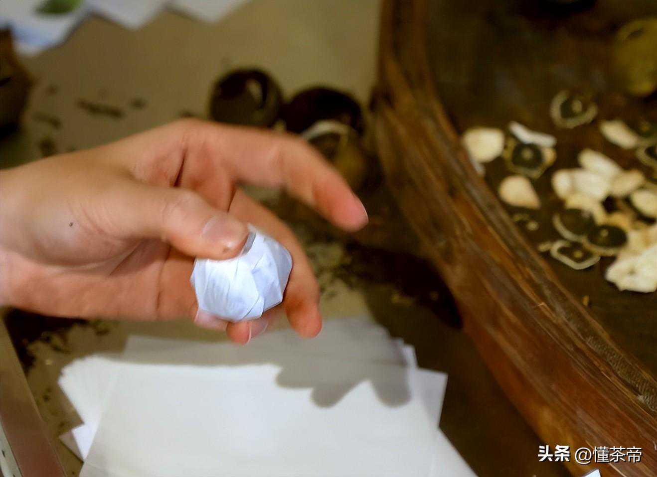 干燥后的小青柑要进行纯手工包棉纸,开果时切掉的果帽会盖回每个小青柑,以保证一整个完整的小青柑。