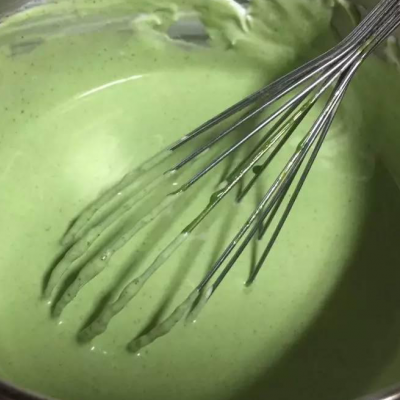 2、取一小碗,将少许蛋液加入抹茶粉,搅拌过筛抹茶糊至细腻无颗粒。再将抹茶糊倒回到蛋奶液中,加入玉米油搅拌均匀。