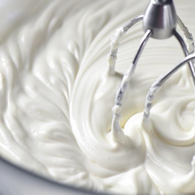 5、淡奶油加入30g细砂糖,打至8-9分发(即奶油表面呈现纹路,拿起打蛋器奶油呈现倒三角状)。