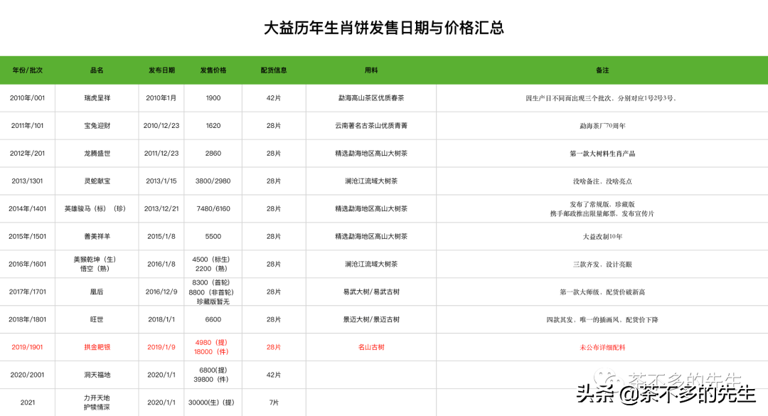 扯远了,产品线上,没有沿用此前两年的大小饼模式,而是生熟齐发,用料方面,大益仅仅是透露了名山古树料,这个名山古树就很值得玩味了,前有澜沧江流域排雷,我们可以认定,凡是没有明说的山头,可统一看作最低的那一档。