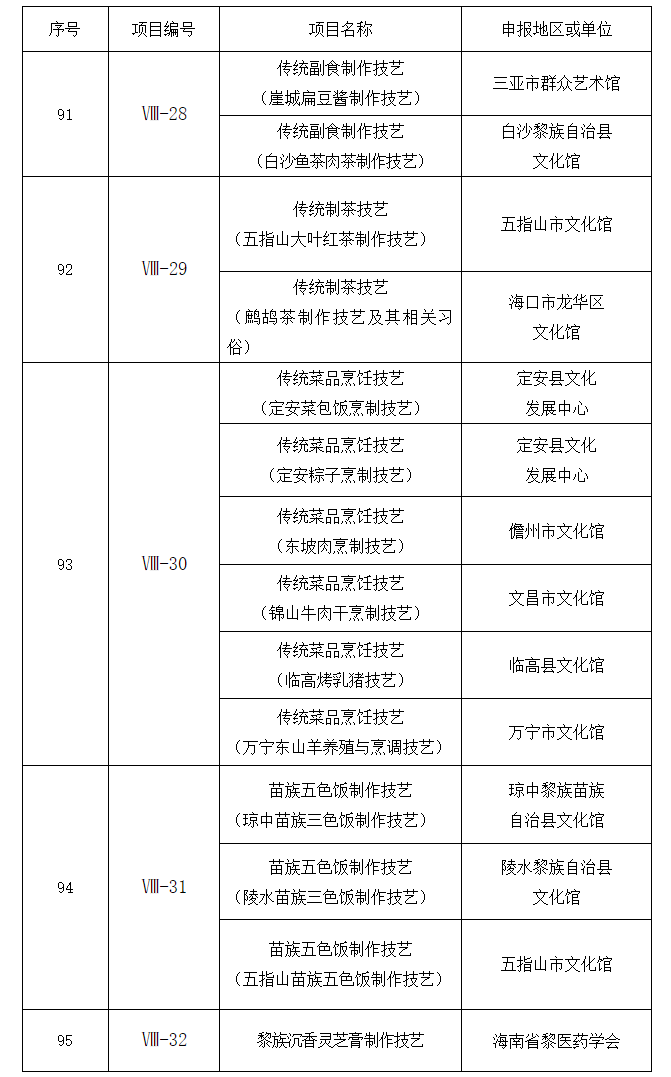 18项列入第六批省级非物质文化遗产代表性项目名录扩展项目名录的,包括由海南省民间文艺家协会申报的崖州民歌、乐东黎族自治县文化馆申报的海盐晒制技艺(莺歌海海盐晒制技艺)、万宁市文化馆申报的海南粉烹制技艺(后安粉汤制作技艺)、儋州市文化馆申报的海南春节习俗(中和闹元宵习俗)、琼海市文化馆申报的海南春节习俗(龙江元宵灯会习俗)等。