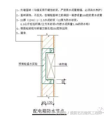 17、暗埋消防箱、接线盒、入户配电箱等箱体背后及入户线管集中处,用C20细石混凝土集中浇注(内衬φ4@200钢筋网片),并振捣密实.管线和箱体须预先埋设。也可做预制砼。箱体与墙厚接近时,应在箱体背面挂设钢丝网后方可抹灰,如箱体位于外墙迎水面,则需做防水。