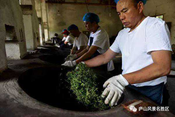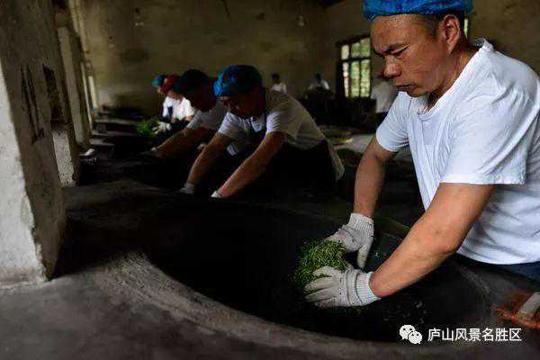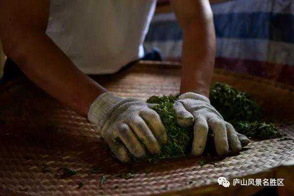 高海拔的庐山云雾茶差不多要到四月中下旬才出芽,其手工制作过程大致分为头次杀青、揉青、二次杀青、搓条、提毫、烘青等几道工序。一锅新鲜茶叶变为成品干茶,整个制作过程耗时约50分钟左右。