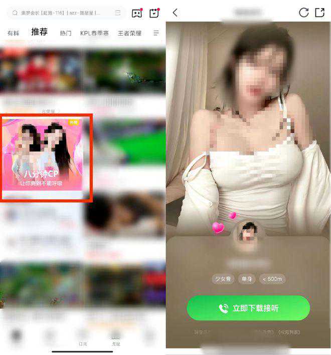 在5月8日当天,燃次元下载虎牙直播APP,打开后首屏推荐界面便有一个疑似打擦边球的广告推送。