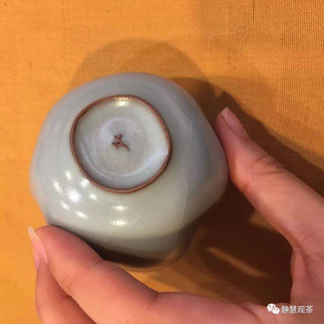 口平坦沿外撇,腹壁近竖直,下腹壁内收,圈足。品茶握于手中,微微外撇的口沿正好压合于手缘,稳贴合手,故称“压手杯”。