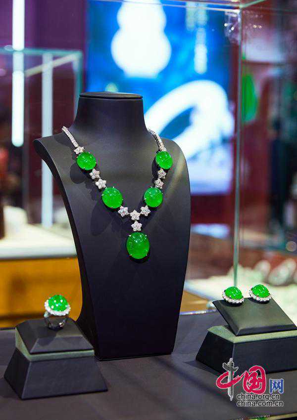 七彩云南镇店之宝绝代风华:九颗老坑帝王绿满色玻璃种翡翠蛋面,18K金配钻工艺配以204粒,总重41.58克拉完美钻石镶嵌成就“绝代风华”。同质同色的水润莹亮,简约中尽显华贵风范。